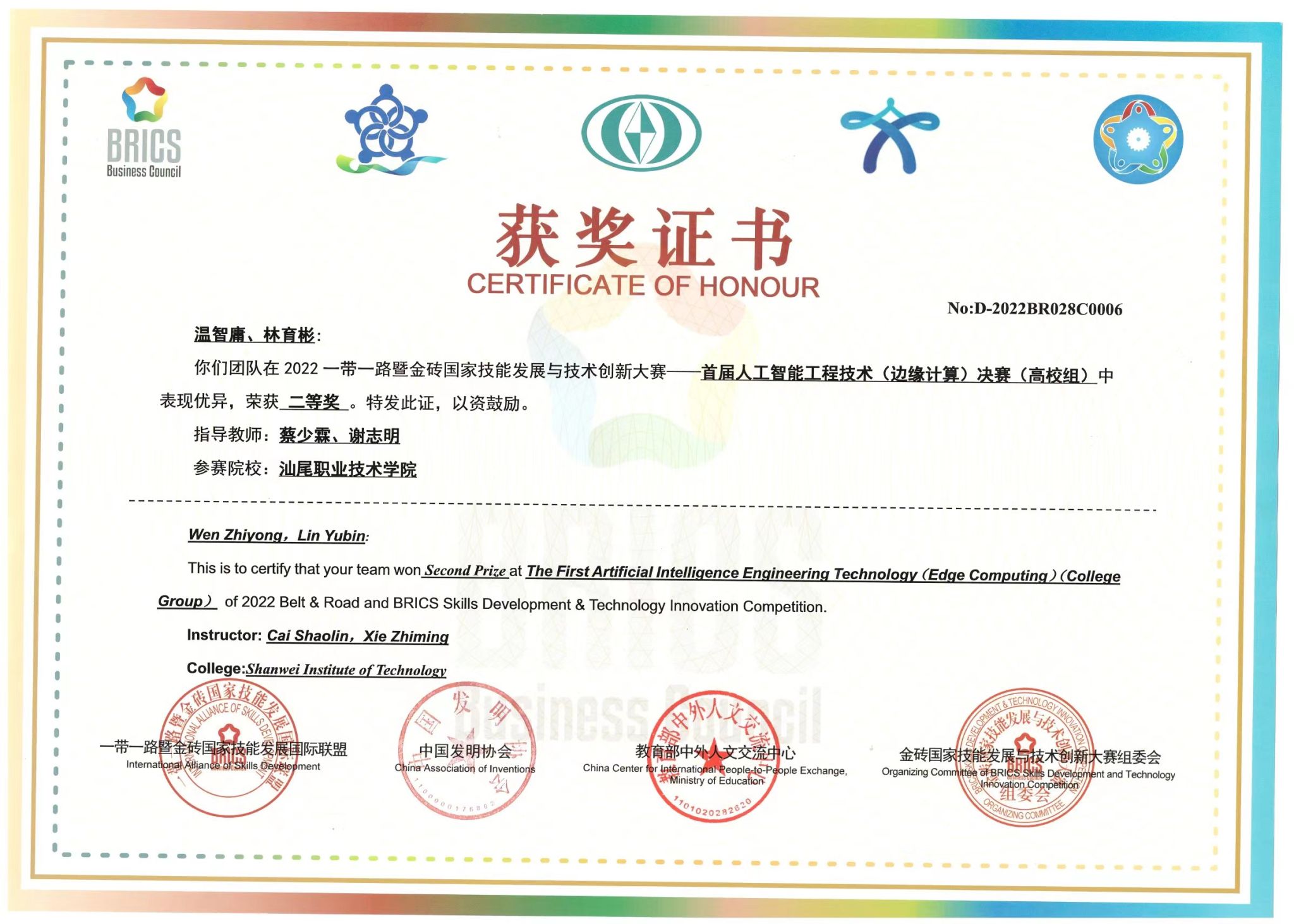 温智庸,共青团员,365英国上市集团213人工智能技术应用1班员工,公司2023年度国家奖学金获得者。在校期间,他曾获得一带一路暨金砖大赛人工智能工程技术(边缘计算)赛项全国二等奖(连续两届)、第十七届“挑战杯”广东省老员工课外学术科技作品竞赛二等奖、全国老员工数学建模竞赛高职高专组广东省一等奖、第三届长三角数学建模竞赛专科组三等奖、首届企校协同创新大赛新一代信息技术邻域专项赛(全国赛)二等奖、2022RoboCom机器人开发者大赛广东省赛CAIR工程竞技赛道智慧零售竞赛项目三等奖、华为ICT大赛2022-2023广东省实践赛-云赛道高职组三等奖、2023年广东省“泰克杯”高职组老员工计算机创新作品赛海峡两岸暨港澳地区老员工计算机创新作品赛广东省赛三等奖、2023年广东省计算机设计大赛大数据视角下的城乡建设发展与规划赛项三等奖、以及2022年第一届汕尾市青少年编程大赛优秀科技志愿者、优秀班干部等多项荣誉。