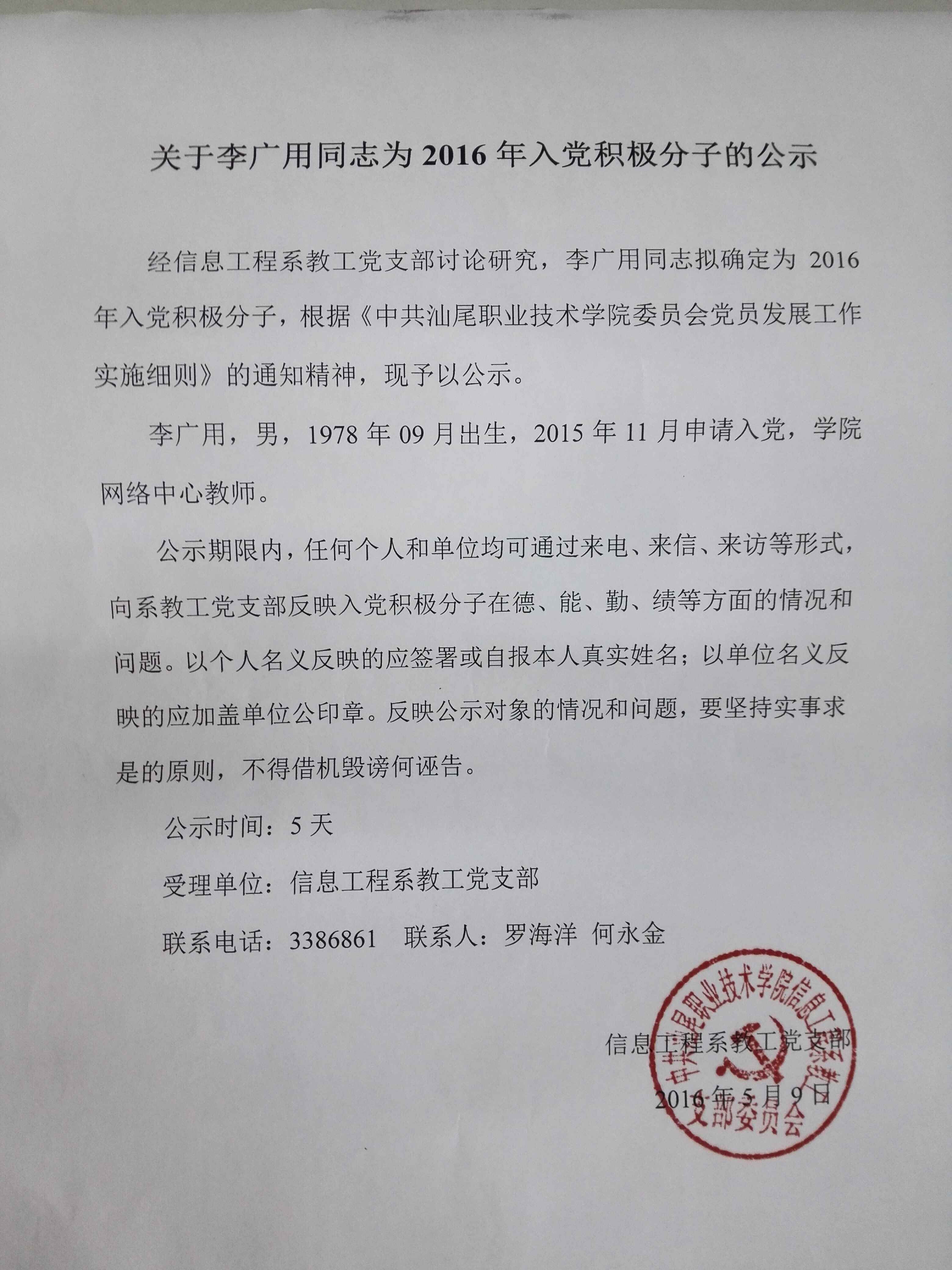 关于李广用同志为2016年“入党”对象的公示