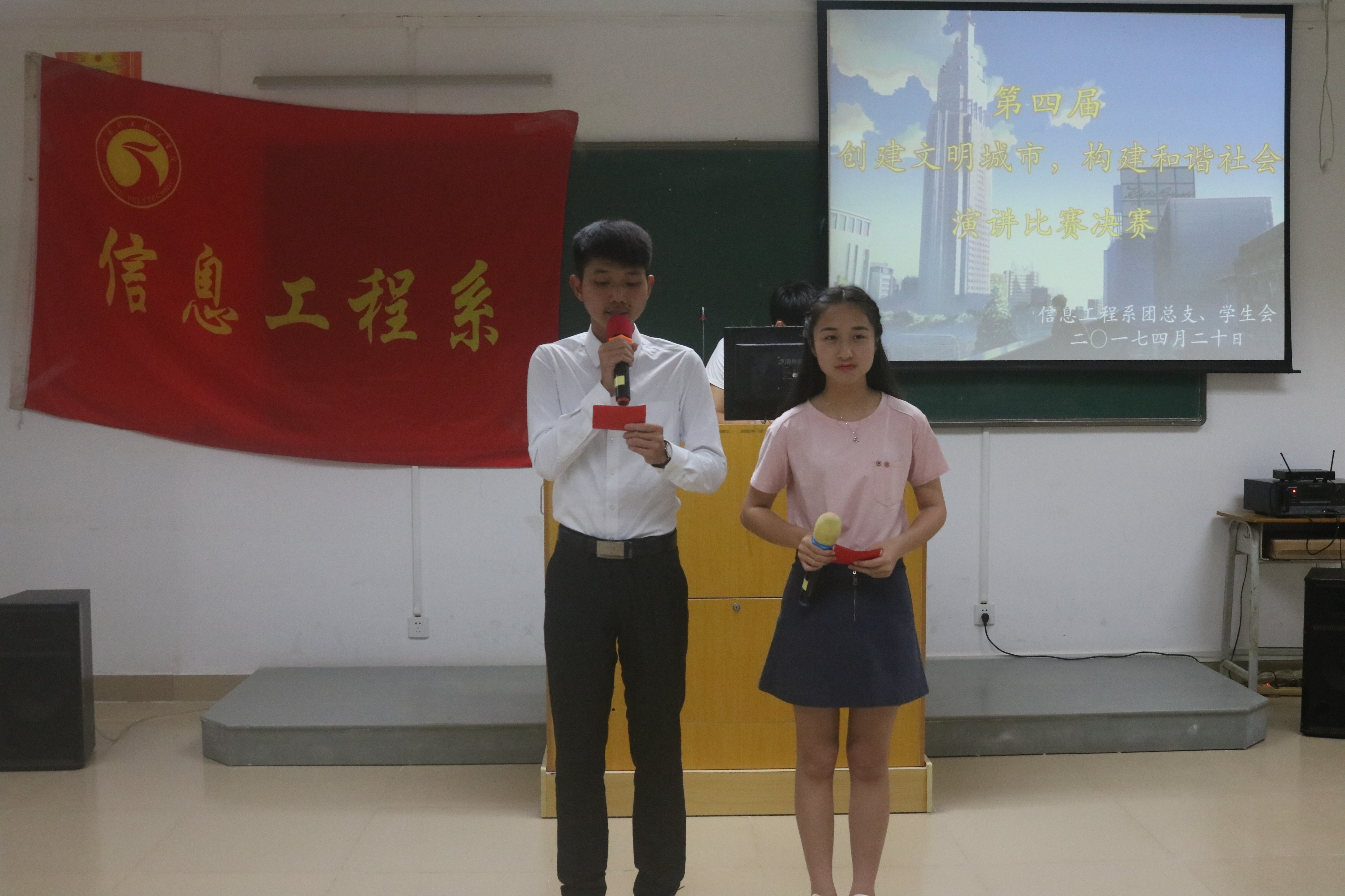 为展现当代青年员工朝气蓬勃,奋发进取的精神风貌,营造和谐校园文化氛围,积极引导和激励广大团员青年更好地传承“五•四”精神,践行社会主义核心价值观,为实现两个百年的中华民族伟大复兴的“中国梦”而努力奋斗。2017年4月20日晚在实训楼410教室,我系第四届演讲比赛圆满落下帷幕,演讲以“创建文明城市,构建和谐社会”为主题。本次比赛历经初赛和决赛,各班级参赛热烈,共有14名选手参加本次比赛,最终9位选手脱颖而出,他们凭借出色的口才、敏捷缜密的思维,微笑中彰显自信、幽默中不失气势等赢得观众的热烈掌声。